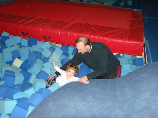 Rich took off the morning to check out Mae's Tiny Tumblers class at Sonshine Gym. Now he has a better understanding for the parent-child involvement and excitement of this fabulous class! The father-daughter pair did very well, but Rich was reluctant to let the girl run wild (Kirsten is not as efficient in preventing the "jail break"), and inturn Mae took advantage of the situation and got Rich to dive into the block pit and help her out (normally she "swims" through the blocks). They both seemed to have a great time!