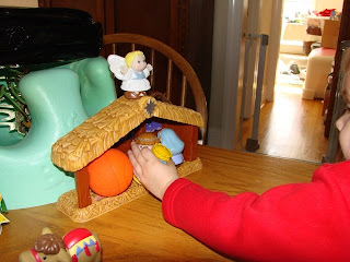 So today we were playing with the Nativity, and she kept telling us that "Momma Mary" had to HUG Baby Jesus, and then smooch the Baby Jesus and then eskimo kiss the Baby Jesus. Then the Baby Jesus and Momma Mary had to go to the manger, which she knows is a special place. So, then there's an open spot (normally reserved for Joseph). But Mae doesn't want Joseph in the manger - he goes with the "not-cow." She rotates in different Kings, but then notices her Fisher-Price basketball. It's about the same height as figures, so it goes in the manger.