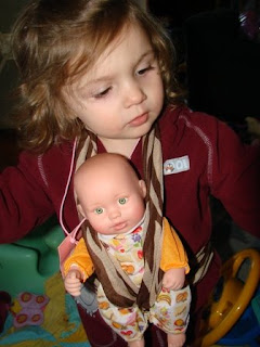 So, we thought Baby Julie was done for the day until Mae insisted Baby Julie was crying and needed to be "cawwied" gesturing to Ben's Bjorn baby carrier. Quick thinking and Mae had her own baby carrier, which she wore all afternoon playing and doing her thing.