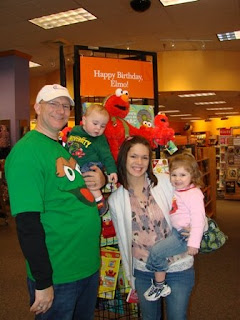 Mae and Ben were "invited" to Elmo's 3rd Birthday Party at our local Borders bookstore this weekend. Aunt Lulu was so excited, she even tagged along! We heard great stories about Elmo and Sesame Street, and played a great Elmo trivia game where Aunt Lulu won Bert soccer stickers for being so Sesame-smart! We even had some wonderful frosted birthday cookies (sorry, none for Ben) and got cool Elmo-birthday coloring sheets. The children's section at our Borders did a great job and made it lots of fun. Not only was it fun, it was fantastic!