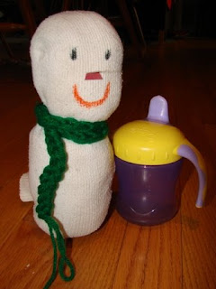 Since we have no snow, Kirsten and Mae made their own snowman today using old socks, some yarn, washable markers (in case we ever need to use the socks) and a scrap of paper. Now, we aren't trying to be sexist -- Mae decided hers was indeed a snowman, who she promptly has named Jim. (Rich said, "Jim? Really, Jim?")