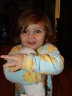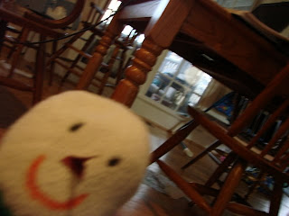 Snowman Jim has been helping Mae over her cold, watching Seasame Street, sharing her breakfast, getting lots of smooches, taking naps, basically doing everything with Mae. She even had to have his picture taken! (Momma's pictures weren't good enough, and Mae had to take a few herself.)